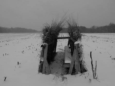 Yes it is 9:12PM if I allow the idea of time time TIME practical yes practical time. In my shed that is covered in snow the yellow glow of the hanging light bulb and my breath is visible in a methodical way over the notebook. Yes it is cold but strangely I don’t feel it today or tonight or anymore? And the fire has just started to roar I can hear it crackling I can smell it I can hear the flu pulling the flame but it is not warm and the log burner is hungry very hungry eating up whole pieces of wood in single bites and I gave myself to the snow today and it took me. And I don’t know if I see the little sparrows differently in the snow or if the little sparrows see me differently in the snow or if I’ve never fully seen them before but today I saw them I saw them. Fluttering up from bones of frost asters. Bones of black-eyed susans. Bones of goldenrods. Bones of Queen Anne’s lace. And I followed them into the meadow and I saw that things die but they don’t really die. They radiate. And went through me yes and I know all go unto one place (Ecclesiastes 3:20 KJV). The place where I came from and it came from the place where I will return and it will return. And I thought of these impossible dead but not dead flowers shriveled up in some quiet corner grasping but they were grasping all and I asked them how how HOW? And I asked myself then what? When you find all your answers? Do you change the way you live? The house you live in? What you eat with whom you eat? Trying to find all the answers have you considered the whole thing is designed so you don’t? And I let go and watched my feet trudge through snow between rows of headless corn. Beautiful corn. Yes I passed the “Tockwogh” trail so many Indian names we use to honor them or names we’ve taken from them or… I don’t know I can’t know it isn’t here to know but then I think yes they are here. I feel them in the land giving heaviness to my feet. All the people who came before me. They ate corn and fish and fowl. And I step into the empty hunting blind high on the cornfield and I look out over the thousands of black stumps toward the tree line. And I think about the story I’m going to tell with corn and fish and fowl. And so I returned, and considered all the oppressions that are done under the sun: and behold the tears of such as were oppressed, and they had no comforter; and on the side of their oppressors there was power; but they had no comforter (Ecclesiastes 4:1 KJV). And the doors of my shed are rattling they are rattling THEY ARE RATTLING the wind is howling through the windows the fire is being sucked from the log burner the walls are shaking the floor is quaking buffalo buffalo buffalo stampeding and I say louder THEN WHAT? WHEN YOU FIND ALL YOUR ANSWERS? DO YOU CHANGE THE WAY YOU LIVE? THE HOUSE YOU LIVE IN? WHAT YOU EAT WITH WHOM YOU EAT? TRYING TO FIND ALL THE ANSWERS HAVE YOU CONSIDERED THE WHOLE THING IS DESIGNED SO YOU DON’T? And the wind has softened. And the fire whispers. And a warrior crouches on deerskin feet. And with bated breath I wait to turn to dust again (Ecclesiastes 3:20 KJV).